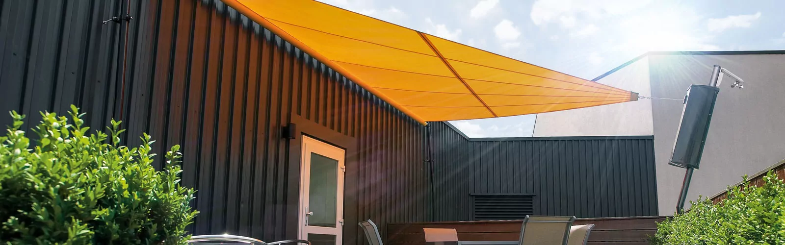 Diese fest installierten Sonnensegel können individuell an jede Hauswand angepasst werden. Mit einem Sonea Sonnensegel finden Sie auch eine Lösung für große Flächen und Ecksituationen.